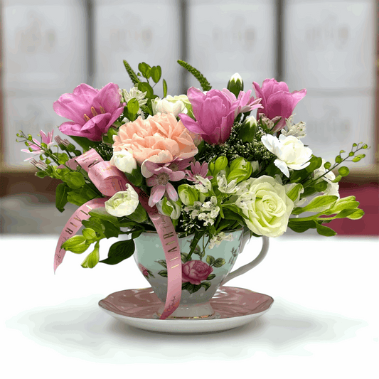 Tea Time in Bloom – Designer’s Choice Teacup Arrangement