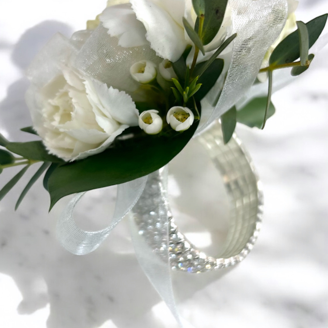 Elevate your prom, homecoming, or special event look with a custom-designed wrist corsage from Flair Flower Bar & Studio. Choose from three gorgeous color palettes—Neutral, Pastel, or Vibrant—each paired with our signature white rhinestone wristlet band for a luxurious and stylish fit.