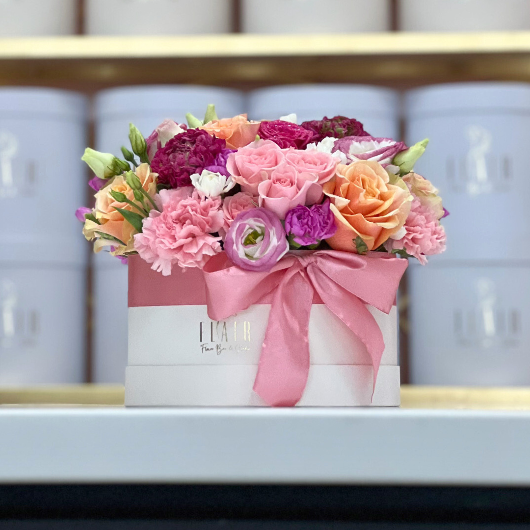 The Le Jardin Flower Hatbox is truly a sight to behold, featuring a combination of roses and assorted colorful seasonal florals that create a lush, fresh-from-the-garden feel.