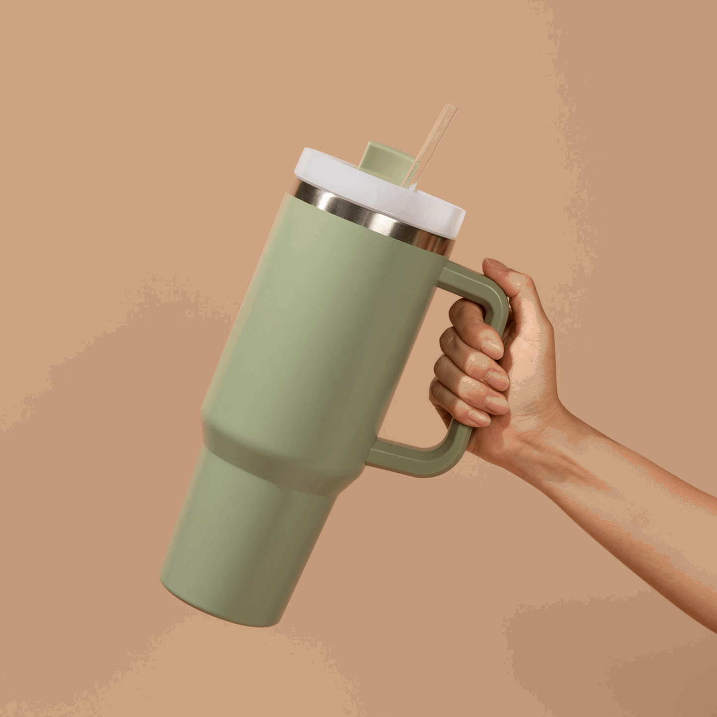 Our tumblers are the perfect companion for your customer's busiest days, with an easy-carry, comfort-grip handle and a narrow base that fits most cup holders. Perfect for any occasion, our premium stainless steel tumbler holds 40oz of any favorite beverage, keeping it hot for up to 8 hours and cold for up to 24 hours. The straw and lid are BPA-free - plus, our functional lid features a sliding sip cover with three positions: a straw opening, a drink opening, and a full-cover top. DETAILS: • 40oz Capacity • Color: Sage Green • Size: 3" x 3.8" x 10.6" (12.2" w/ straw) • Package Size: 5.2" x 5.2" x 11.6" • BPA Free Lid and Straw • Stainless Steel • Keeps Drinks Hot for Up To 8 Hours; Cold for 24 Hours • Designed in the USA, Imported • Style No. TU004 ITEM CARE: • Dishwasher Safe • Do Not Microwave • Wash before use and avoid abrasive cloths when cleaning